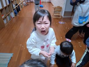朝、スイミングだったので、お昼寝、おやつの後、節分の由来をおはなしをして、みんなでバスケゴールの鬼に向かって、「泣き虫鬼、おにはそと〜❢」「おはなし聞かない鬼、おにはそと〜❢」と、がんばりたいことを言葉にして、まめまきしていると…